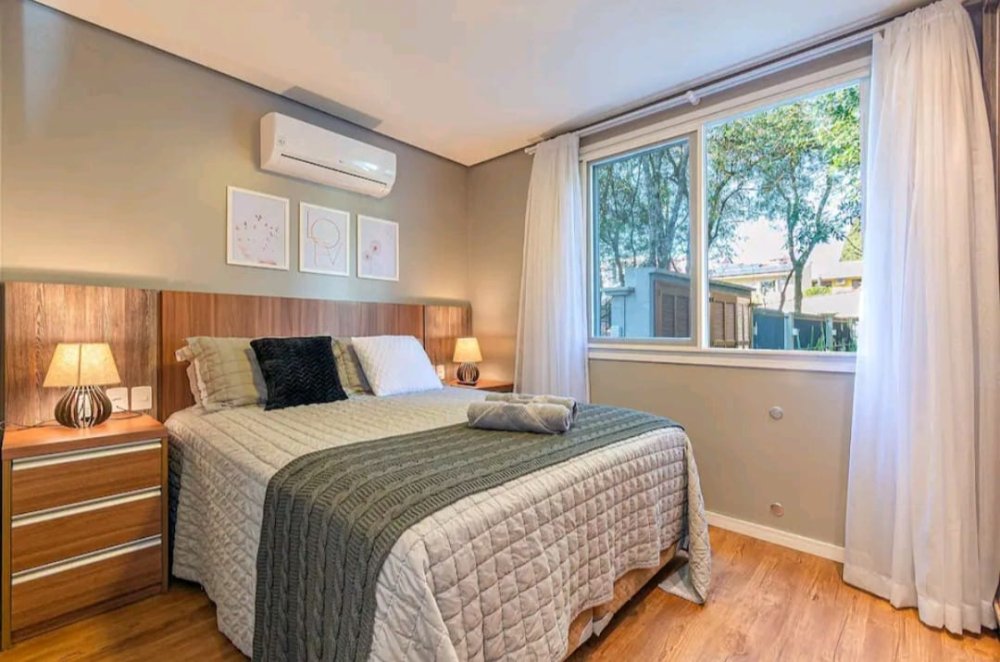 - Janelas em PVC cor branca, com telas e cortinas;
